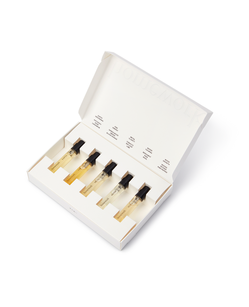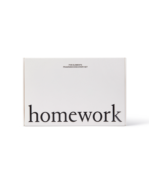 Discover the elemental aromas of Homework's handcrafted eau de parfums. All five of Homework's popular asian-inspired scents — Wood, Fire, Earth, Metal and Water, are captured in spray vials to layer with intention or offer as a gift of aroma exploration.
