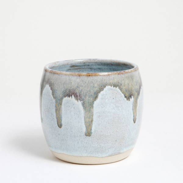 Maki Baxter's Curve Tumblers are hand-thrown on the wheel and hand-glazed, making each one unique. Their smooth curved forms are comforting to cup in the hands, with glimpses of soft throwing lines purposely peeking through a rich, dripping, brushed glaze. Maki describes the glaze as citrus blue — the undertones of an aquamarine almost luminous beneath browns and greens. Each one is fired twice and brushed with four layers of glaze.
