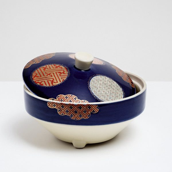 A mid-Showa piece from a once well-loved minshuku (family-run inn) in Shizuoka, this vintage porcelain lidded bowl is made of Japanese Arita porcelain. The family kept the bowls after shutting shop in the 1980s, but just didn't find a use for them since. The rich blue base glaze is hand painted with red and gold motifs that their previous owner says are traditional patterns of good fortune — something they wanted to present to guests at the dinner table.